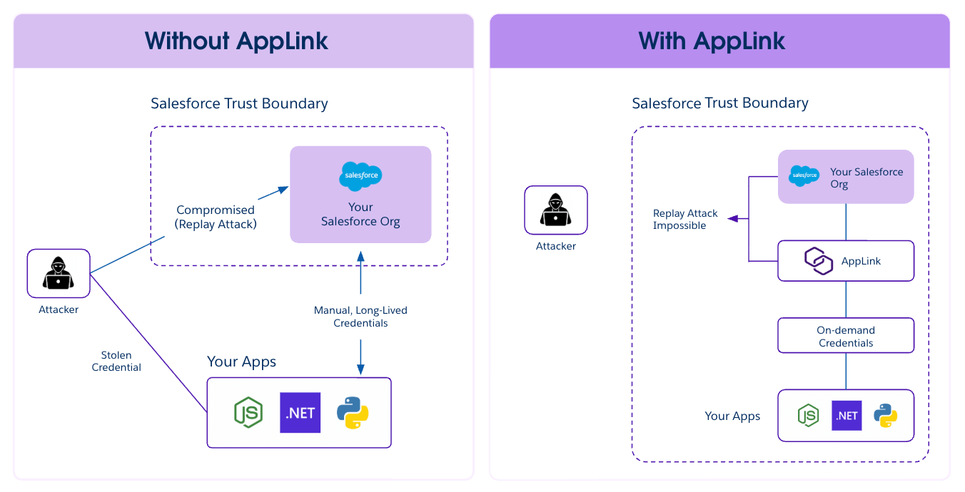 Heroku AppLink is designed to deliver a modern, robust security posture by directly tackling this crucial vulnerability. With AppLink, you can secure your microservice integrations by moving away from storing and managing long-lived secrets. The architecture is simple and powerful: AppLink provides your microservice with on-demand tokens on demand. This significantly reduces the window of opportunity for an attacker because there is effectively nothing for them to steal or replay to gain long-term access. By switching to dynamic, on-demand credentials, you ensure your Salesforce data is protected in a microservice environment.